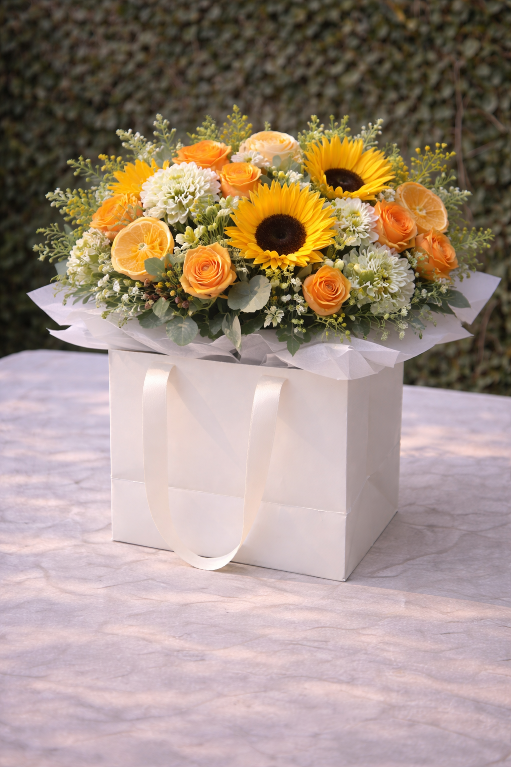 סידור שמח וחם בגווני צהוב־כתום עם חמניות וורדים, מלא אור ונוכחות — מושלם למי שרוצה "זריחה" על השולחן במארז יוקרתי